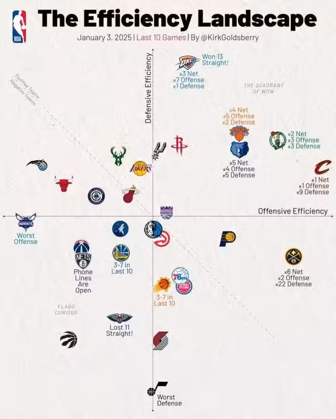 2025年1月4日,NBA正式公布了過去10場比賽的攻防效率,其中克利夫蘭騎士和俄克拉荷馬雷霆成為了獨一檔的存在。前者作為聯盟第一,在新帥阿特金森的帶領下成功打出了摧枯拉朽般的進攻,獨占鰲頭,用極致的轉換進攻搭配三分球的占比使用率,成功讓加蘭和米切爾這樣的全明星後場爆發,雖然現階段球隊陣容中人員不齊整,但並不影響後續的化學反應,甚至美國的博彩公司都預測,克城打進NBA季後賽的機率達到100%。