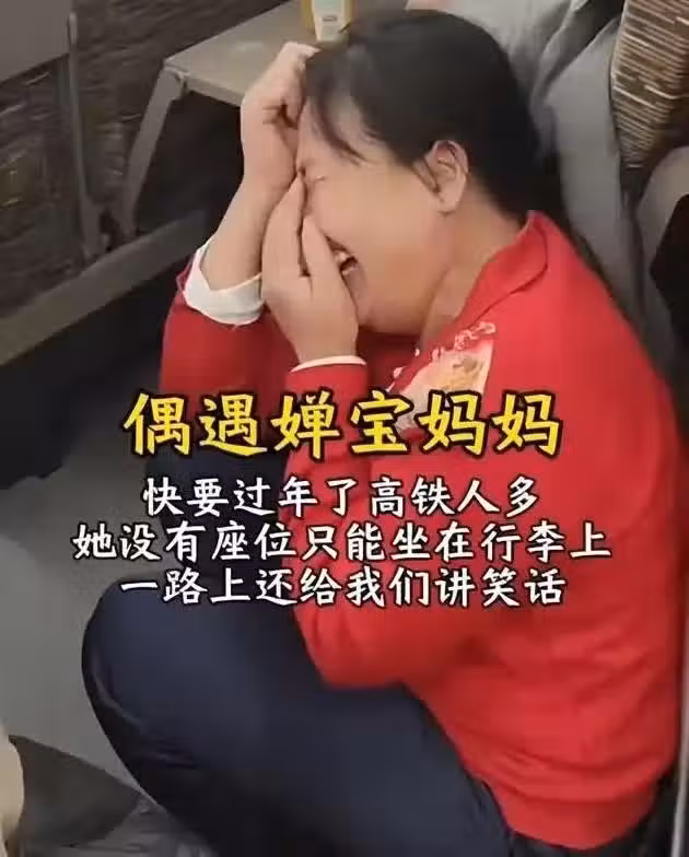 全媽媽去看望兒子,坐高鐵沒搶到有座票,坐在行李袋上仍笑容滿面**