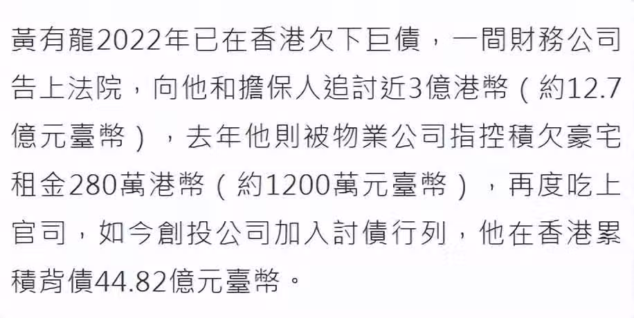 黃有龍債台高築,去年被起訴拖欠280萬租金,這是他租用豪宅及車庫的費用,但黃有龍連這筆錢都付不起,被房東起訴到法院。