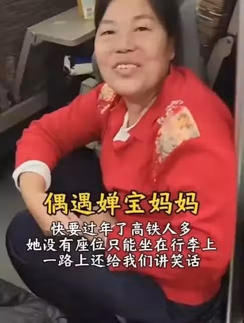 全媽媽去看望兒子,坐高鐵沒搶到有座票,坐在行李袋上仍笑容滿面^^~