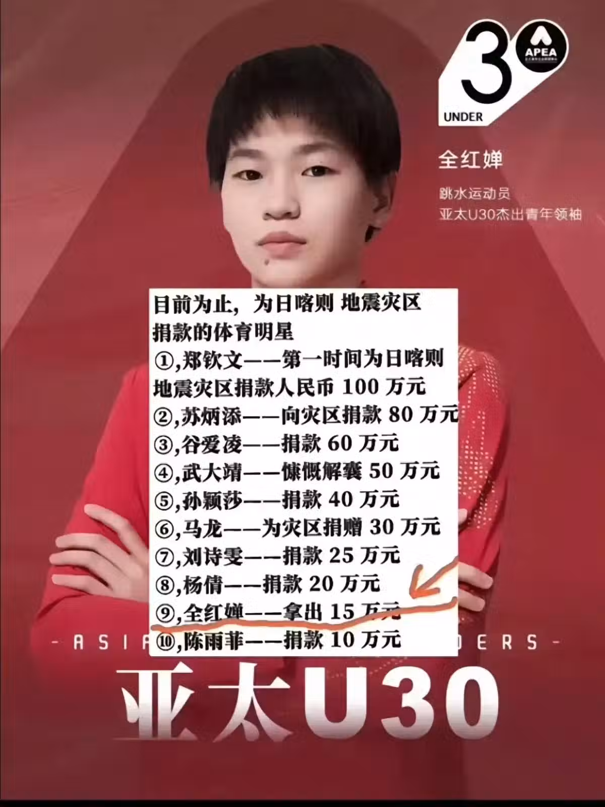 在西藏日喀則地震捐款名單中,最讓我驚訝的莫過於全紅嬋了!**