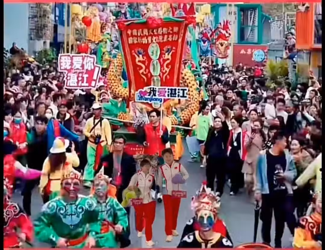 後面謝哥舉著「我愛湛江」牌子,謝哥的後面是彩色的龍。