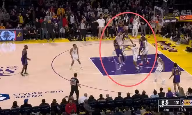 本來湖人當時102:95領先7分,看上去勝局已定,此時里夫斯突然開始刷分。籃網這邊投中三分追到只差4分,叫停之後回來里夫斯強行突破中投不中,拉塞爾後面投丟了一個三分,里夫斯又是突破再中投還是不進。