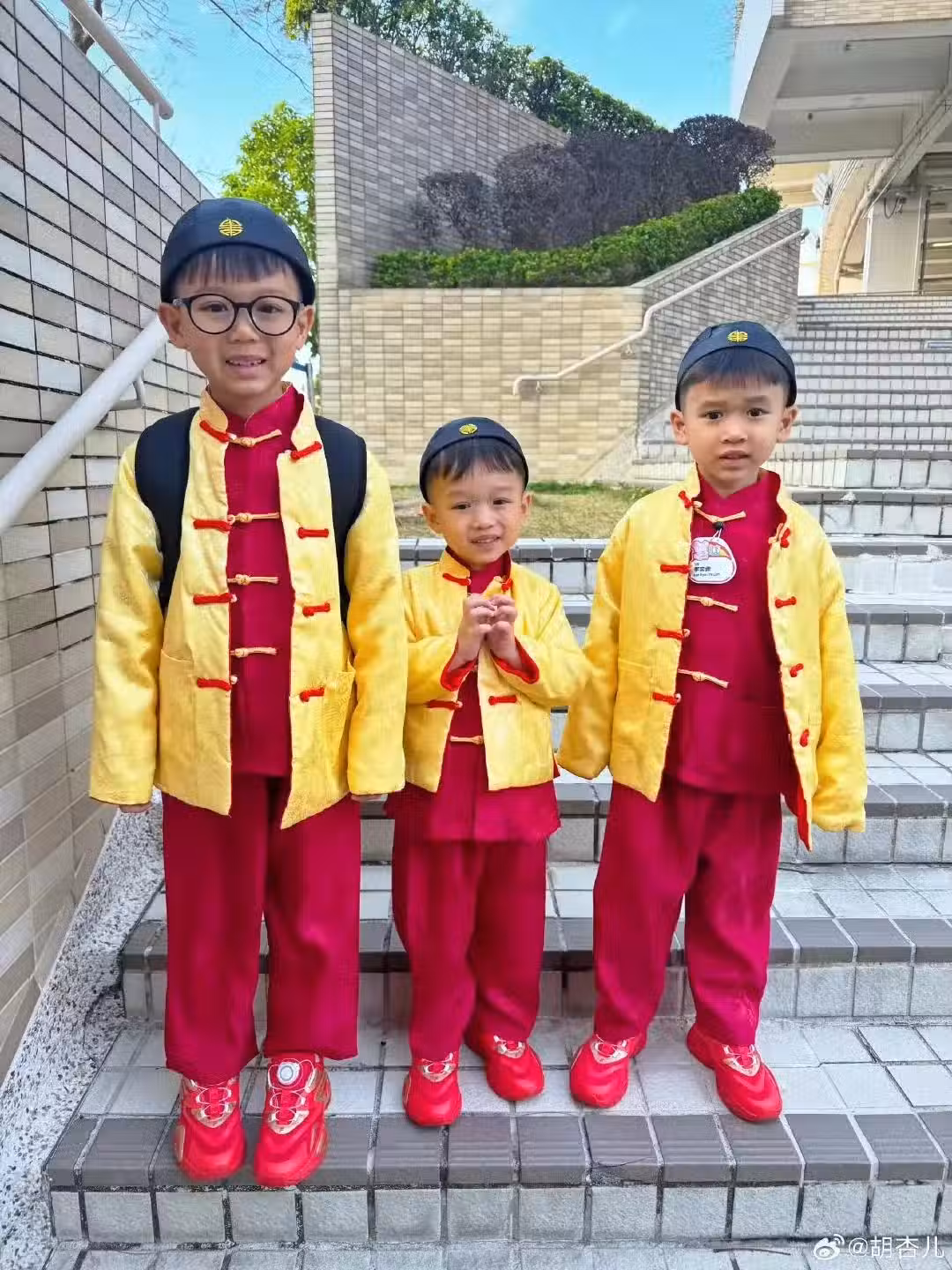 胡杏兒一家五口迎新年,三個兒子穿唐裝帥氣可愛,模樣似複製粘貼