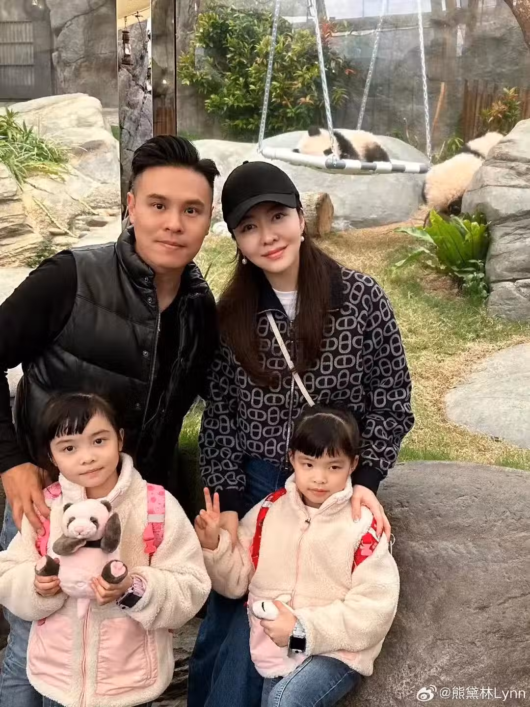 照片中,熊黛林戴著棒球帽,身穿黑色外套和牛仔褲,一身休閒裝時髦有范。郭可頌身穿黑色羽絨馬甲,打扮帥氣。一對雙胞胎女兒穿著同款粉色外套,扎著同款馬尾,姐妹裝造型甜美可愛。一家四口跟大熊貓合影,溫馨又可愛。