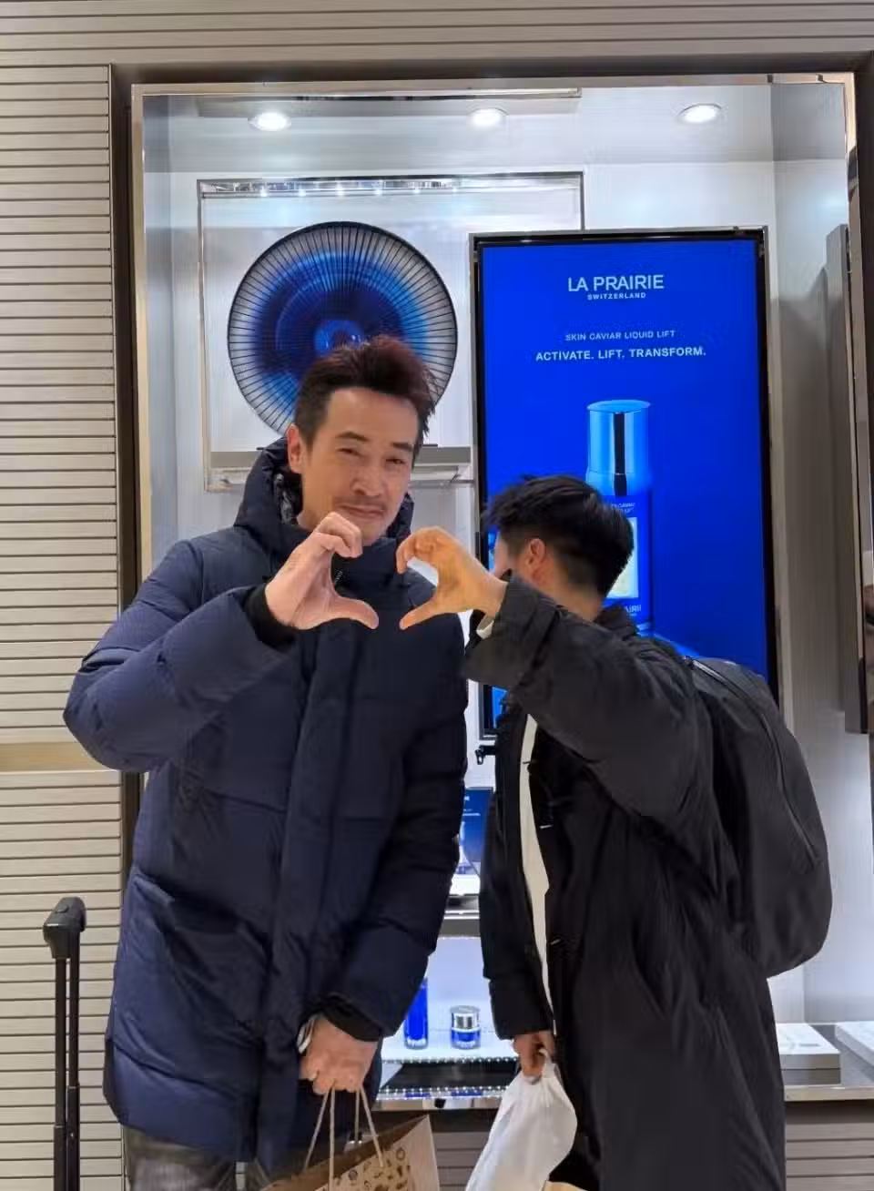 陳豪拿著行李耐心等太太陳茵媺買化妝品,遇見遊客求合影開心配合