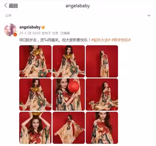 1月28日是除夕夜,當天許多明星藝人也紛紛在個人的社交平台上分享了美照,慶祝這個專屬於我們的團圓時刻。Angelababy也曬出了一組九宮格美照,並為此配文:「祥龍辭歲去,靈蛇納福來。祝大家新春快樂!」還帶上了「蛇年大吉」、「新年快樂」的話題。