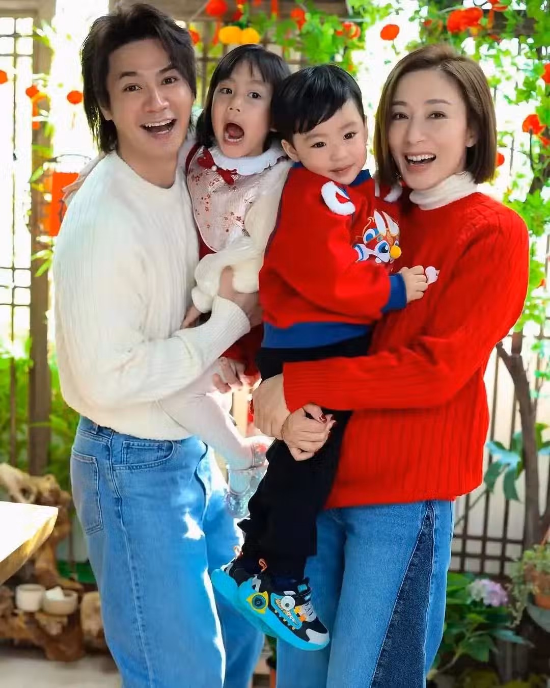 照片中,楊怡身穿紅色毛衣搭配藍色牛仔褲,羅仲謙身穿白色毛衣搭配牛仔褲,夫婦倆新年穿情侶裝恩愛甜蜜,看起來登對養眼。4歲的女兒小珍珠紅色裙子,打扮甜美可愛。3歲的兒子Eden身穿紅色衛衣,喜慶可愛。楊怡抱著兒子,羅仲謙抱著女兒,一家四口對鏡露出燦爛笑容,洋溢著滿滿幸福。