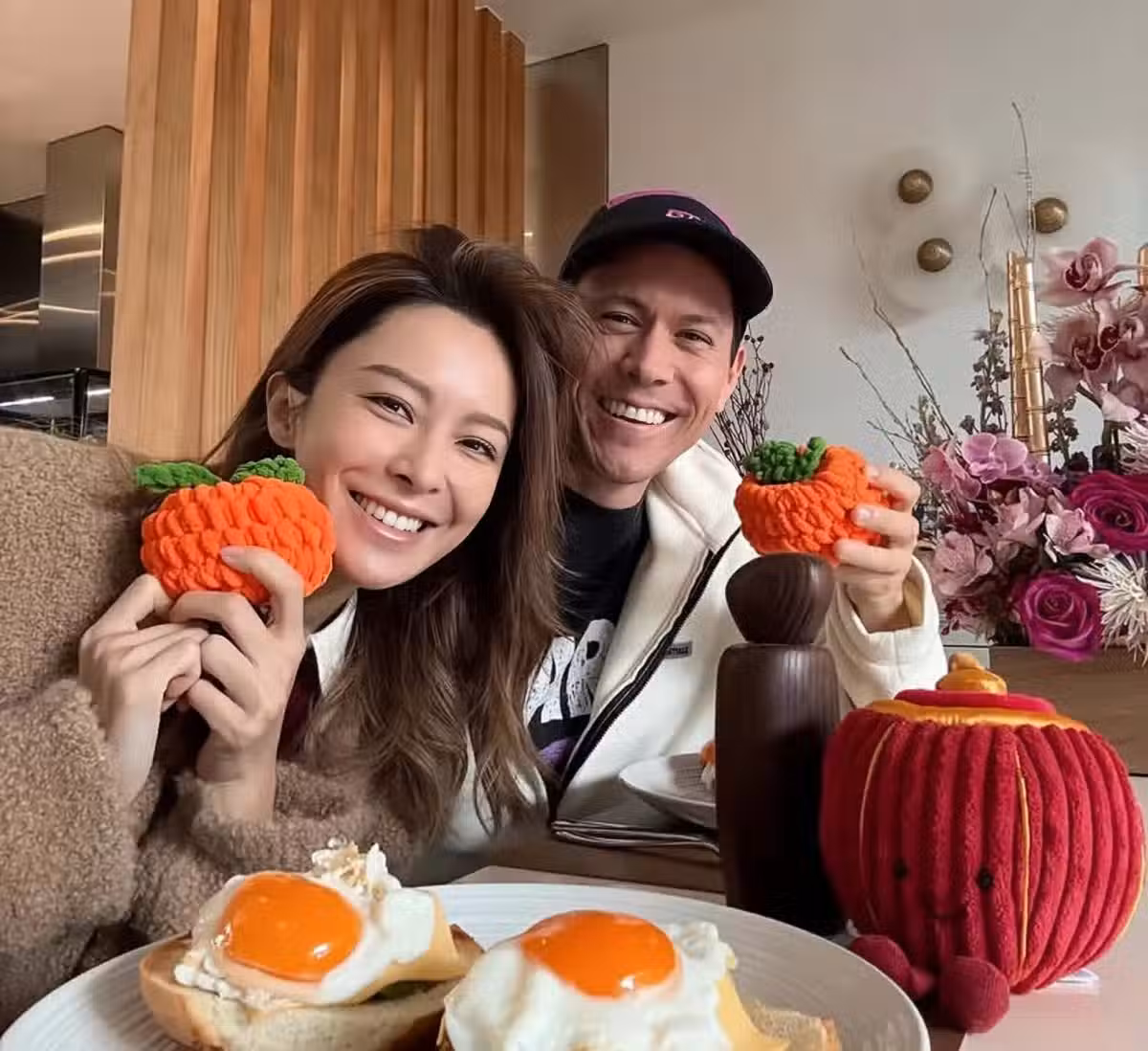 照片中,張曦雯化著精緻的妝容,打扮相當喜慶。她的外籍男友依偎在她的身旁,兩人看起來夫妻相十足。