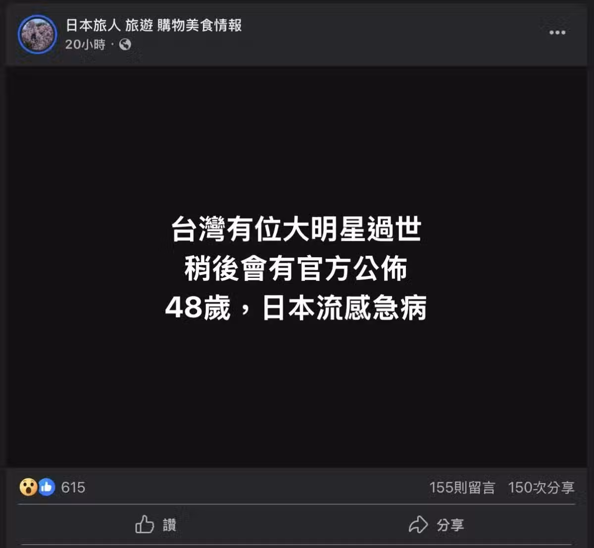網友在臉書上爆料台灣女星死訊。(圖/翻攝自日本旅人 旅遊 購物美食情報臉書)
