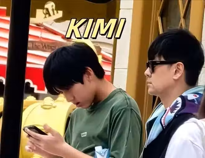 該網友稱是大年初一在新加坡環球影城偶遇了林志穎一家。林志穎戴著墨鏡正在凝神觀看著什麼,身旁穿墨綠色T恤的便是Kimi,他正低著頭玩手機,雖然低著頭但個子已經超過爸爸林志穎了。