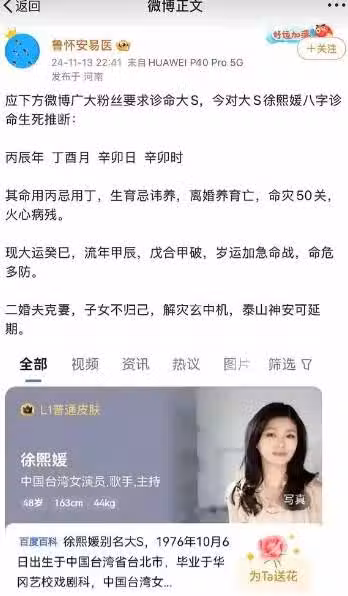 「魯懷安易醫」在 2024 年 11 月 13 日發布的微博中, 以八字命理分析大S,指出其「命災 50 關,火心病殘」,更預言「二婚夫克妻,子女不歸己」。當時這番言論並未引起太多關注,如今看來卻令人毛骨悚然。