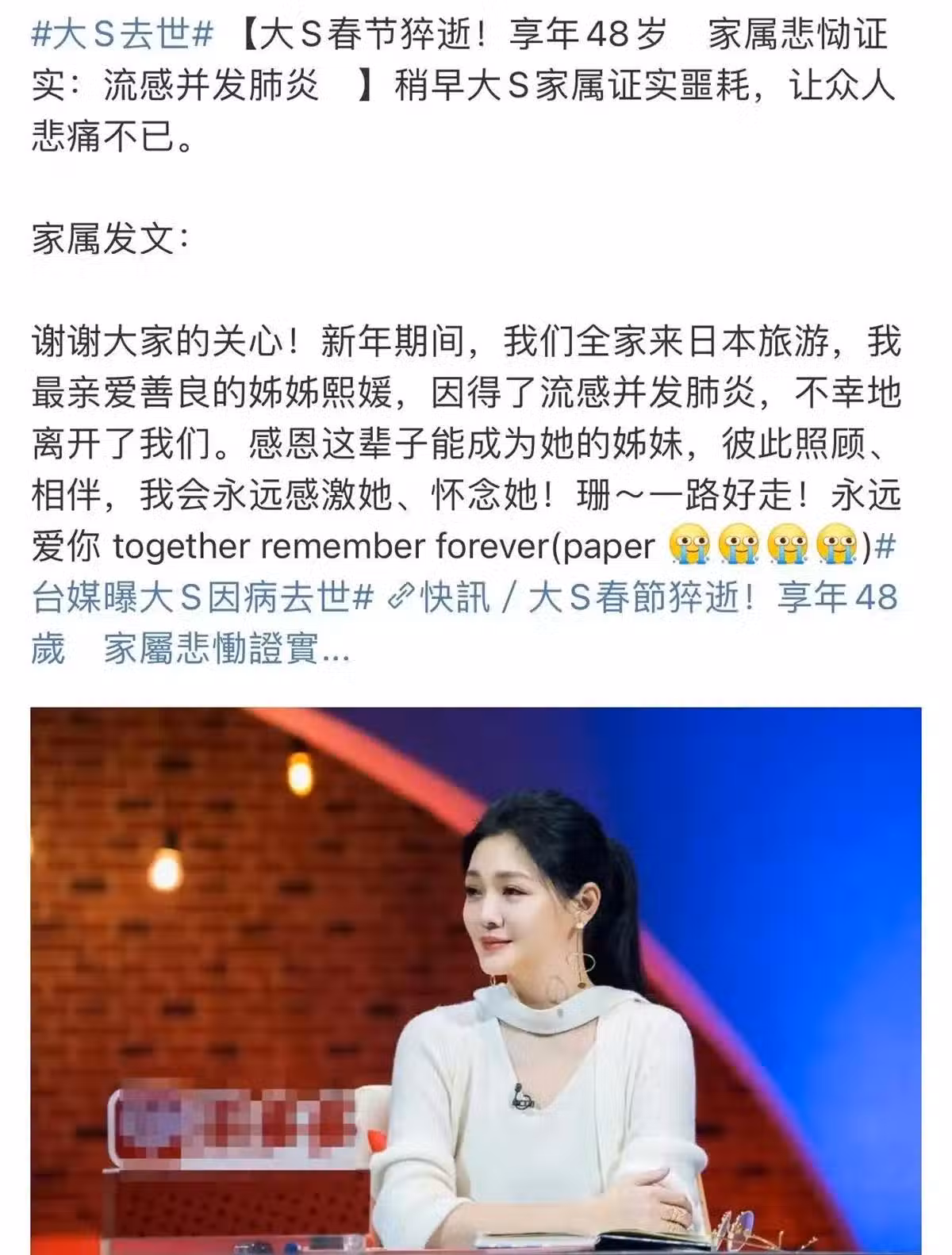 大S去世的消息傳來,享年48歲,令人悲痛不已。