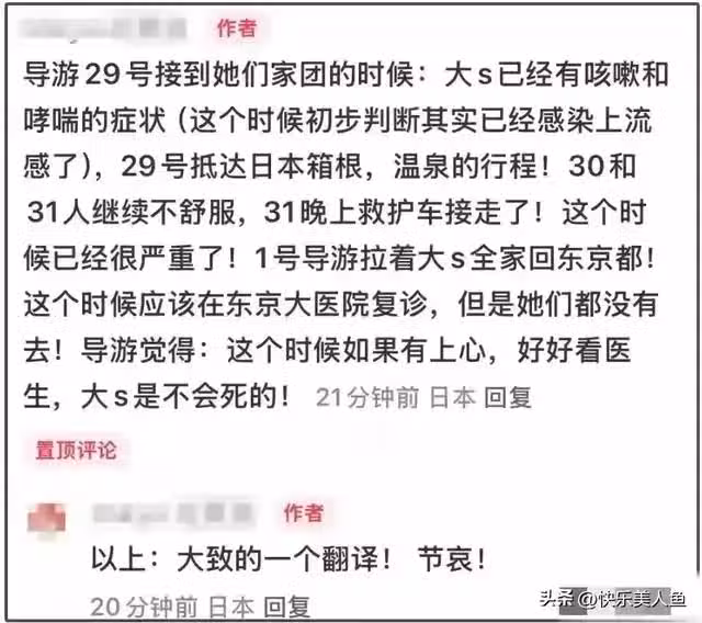 這位導遊說泡了溫泉,大S30號和31號人都特別不舒服,在31號晚上還被救護車接走了。