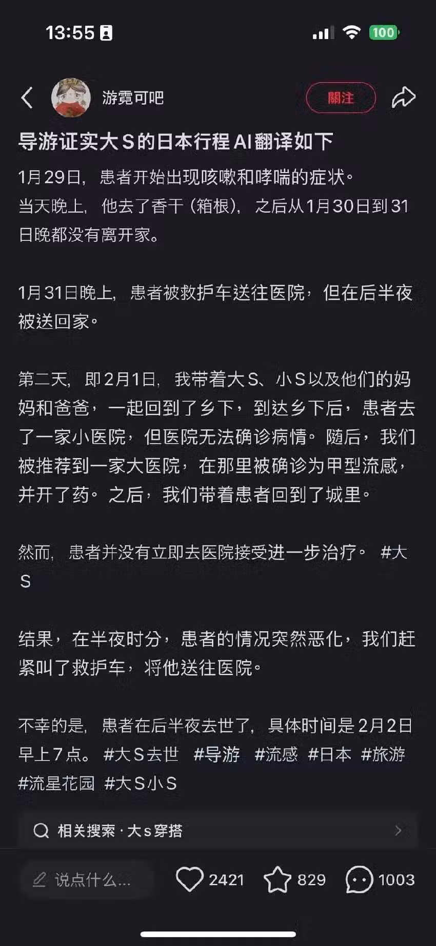 不料當晚病情急轉直下,送醫搶救無效,於2月2日上午7點離世。