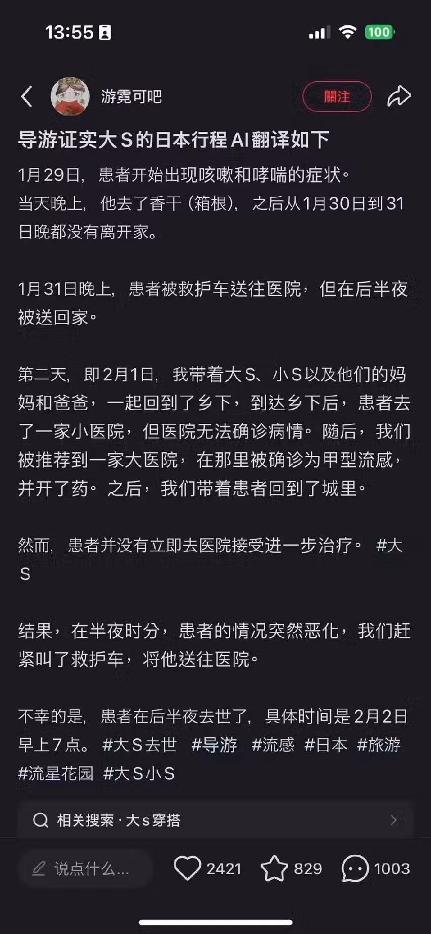 根據《ETtoday》報導,一名自稱是接待大S一家的導遊在「小紅書」透露,事發始於1月29日,當天大S就身體不舒服,已出現咳嗽及哮喘症狀,仍堅持與家人同行出遊,到箱根泡溫泉後病況持續惡化,30日至31日期間都未離開旅館,2月1日確診為A流,當晚病情急轉直下,送醫搶救無效,於2月2日上午7點離世。
