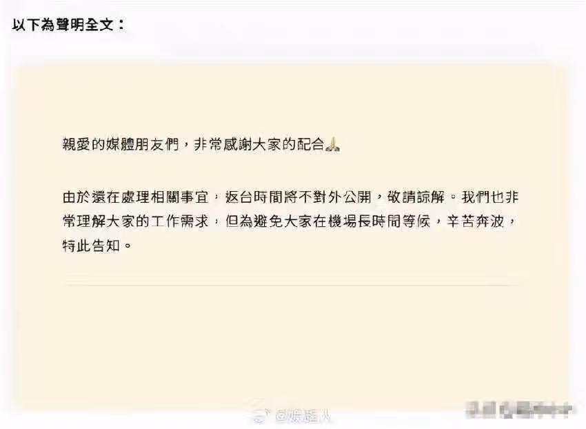 另一邊,面對眾多媒體的等待,小S也二次發聲,表示返台時間將不對外公開,「由於還在處理相關事宜,返台時間將不對外公開,敬請諒解。