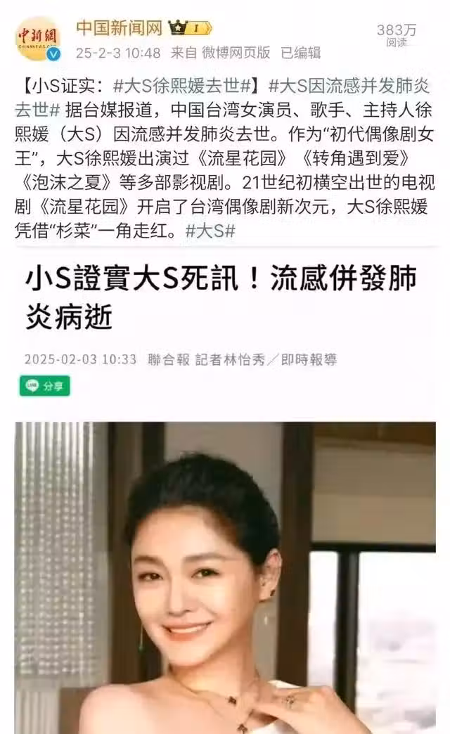 身為家屬的小S悲痛回應這一噩耗,全網震驚。