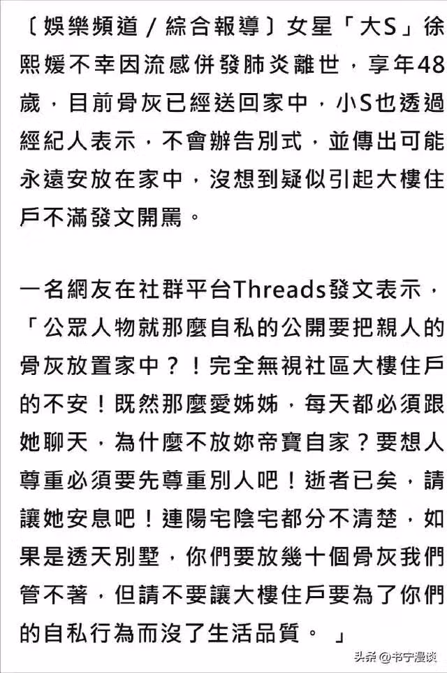 大S鄰居發聲,怒斥徐家把骨灰放家中,喊話小S:為什麼不放你家