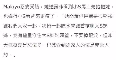 Makiyo透露,2月8日看到小S後馬上抱抱她,覺得小S看起來更瘦了,她崩潰但還是很堅強,和大家一起吃水果喝香檳、聊大S,Makiyo說儘量守住大S姐姐的願望,不要掉眼淚,但昨天的氣氛還是悲傷比較多,也感受到徐家人的傷是非常大的。