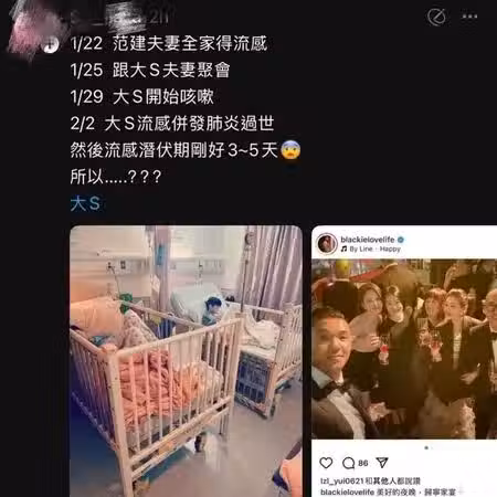 有網友列出時序,范瑋琪1月22日在ig貼出雙胞胎兒子得A型流感住院照,稱「全家都病懨懨的」。1月26日黑范夫妻就一起參加王偉忠女兒歸寧宴,還和大S開心合照。1月29日大S就出現咳嗽症狀,2月2日就因流感並發肺炎病逝。
