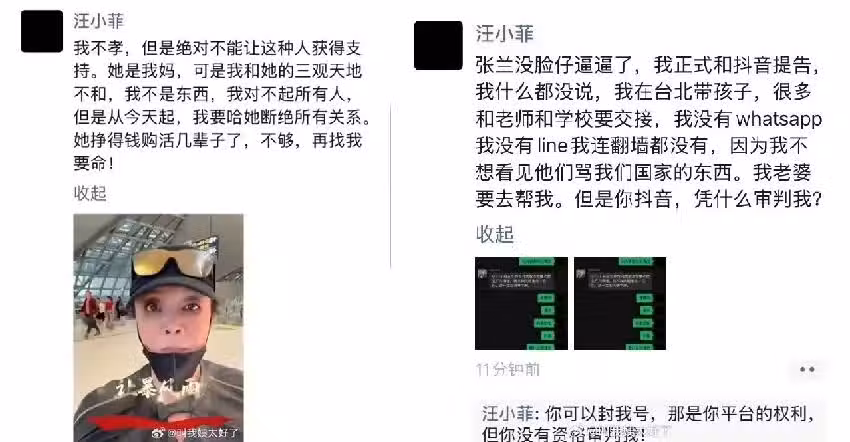 根據流出的朋友圈截圖顯示,汪小菲直言,「我不孝!但是絕對不能讓這種人獲得支持,她是我媽,我和她的三觀天地不和,我不是東西,我對不起所有人,從今天起要和她斷絕所有關係,她掙得錢夠活幾輩子了,再找我要命」,同時也對抖音的裁決表達不滿,揚言提告。