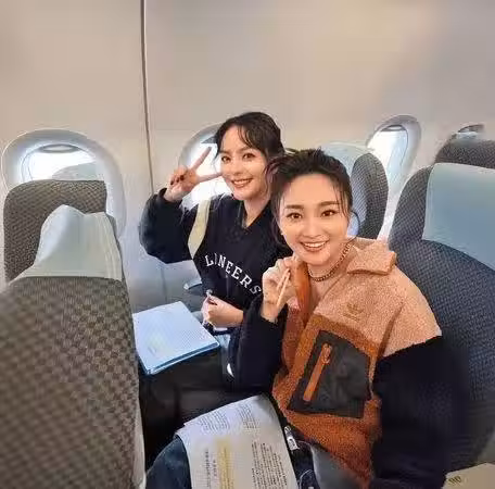 張文綺(右)與師妹宜芳(左)搭機赴金門擔任跨年晚會主持重任(時代創藝提供)