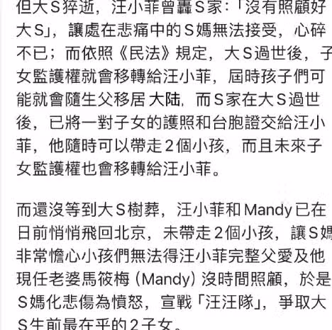 大S去世後,她兩個孩子的歸屬各位引人注目。