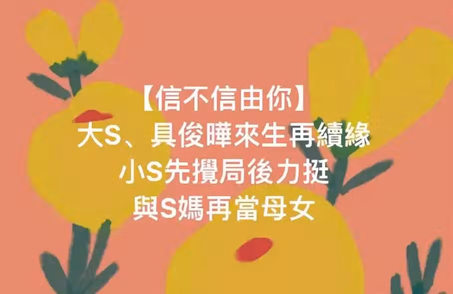 2月14日,有台媒不知道從哪得來的消息,直接放出了一個預言:信不信由你,下輩子大S和具俊曄還會再續前緣,小S先是攪局,但後來被倆人的真情打動,然後力挺。不僅如此,大S還會和S媽繼續做母女,這輩子大S沒有享到的福氣,下輩子還能補回來!