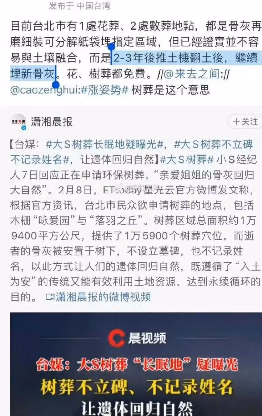 現在就等著擇日給大S樹葬,不過聽說樹葬並不是大家想的那樣,而是每兩年推土機翻土,原來的位置又要放入其他人新的骨灰,而且骨灰很難和土壤融合,到時候就分不清都是誰的骨灰了。