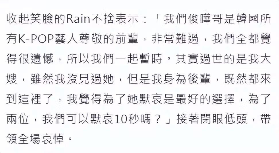 Rain演唱會懇求全場為大S默哀10秒,以大嫂尊稱,心疼具俊曄喪偶