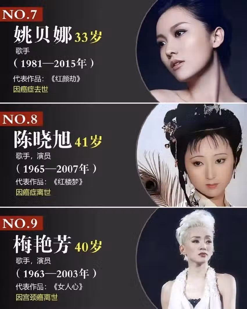 姚貝娜: 33歲歌手(1981--2015)代表作品:《紅顏劫》因癌症去世。