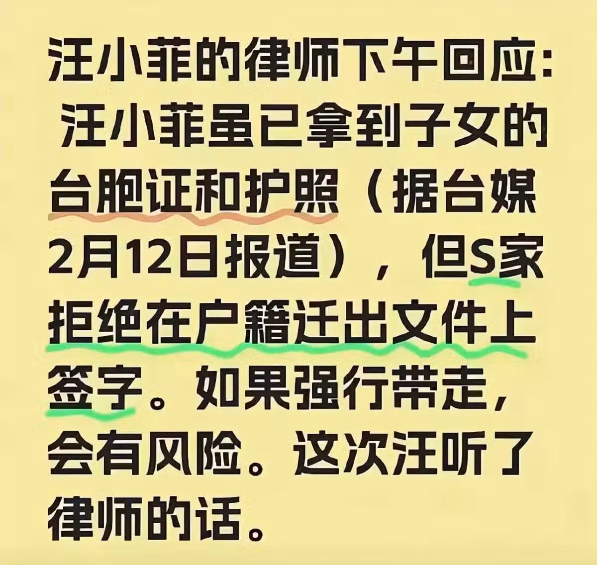 S媽黃春梅曾多次發文並疑向汪小菲宣戰,被曝試圖爭奪大S子女監護權,可能涉及通過子女獲取汪小菲的撫養費,而雖然台媒還稱S媽對汪小菲悄悄回北京不滿,暗示汪小菲拋下子女,而汪小菲方面則表示監護權尚未移交,S家拒絕簽字,導致帶回孩子有風險,並強調帶回孩子是早晚的事,相關事宜正在走程序。