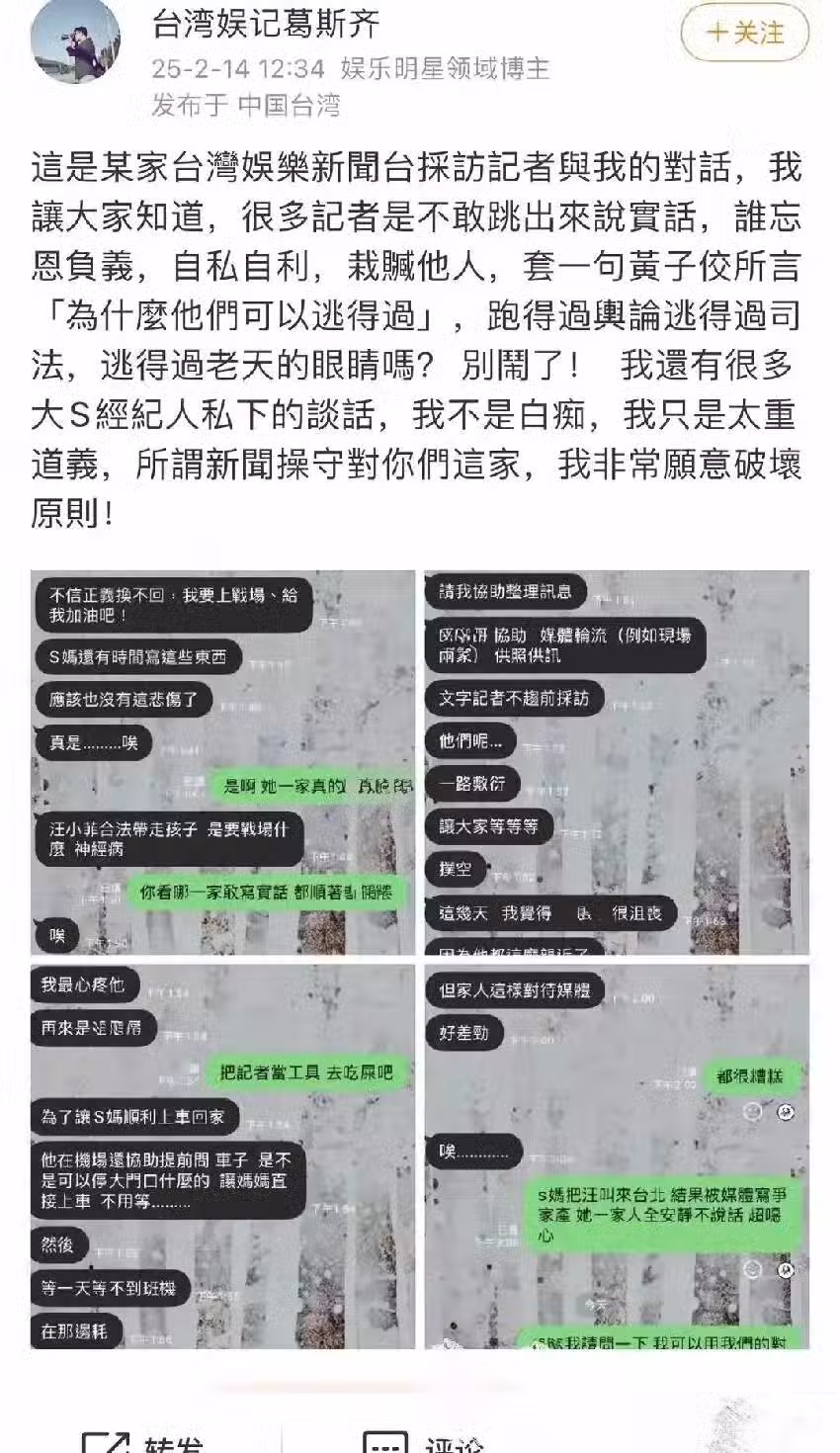近日在社交媒體上,台灣記者葛斯齊跟同行的聊天記錄曝光出來了,說很多記者不敢跳出來說真話,他想讓大家知道誰才是哪個忘恩負義,自私自利的人,還說S家沒有一句真話,謊話連篇,不值得相信。