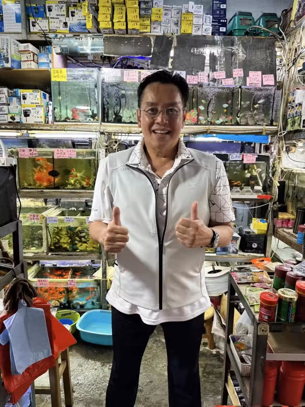 74歲譚詠麟到街邊小店,買了幾條金魚,不擺架子,和店主友好交談