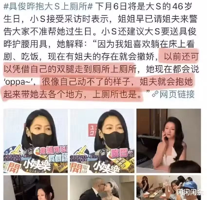她公開說大S生活不能自理,需要具俊曄抱著才能去洗手間。