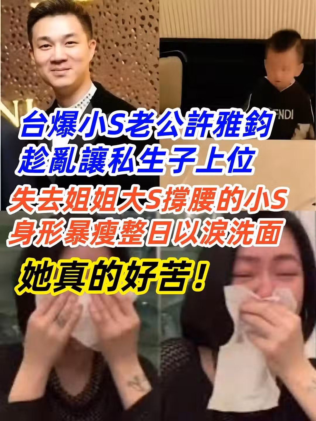 台媒曝許雅鈞趁亂讓私生子上位,失去姐姐大S撐腰的小S,身形暴瘦整日以淚洗面,她真的好苦