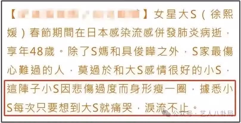在這樣的情況下,私生子上位的可能性似乎也不是沒有。畢竟,小 S 沒了大 S 的撐腰,而 S 家以前的主心骨就是敢愛敢恨的大 S,小 S 一直都很聽姐姐的話。現在大 S 不在了,S 家就像沒了頂樑柱,未來會怎樣,誰也說不準。