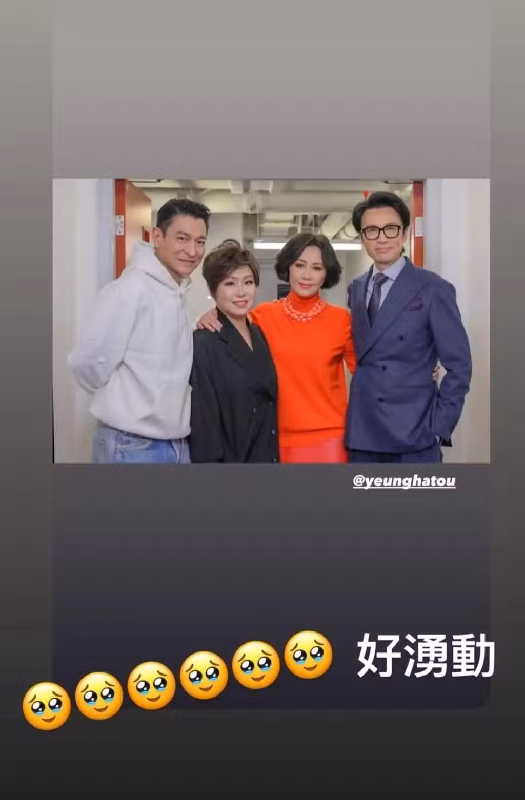 另一張則見到劉德華摘下口罩,與黃子華、劉嘉玲合照,同樣有份演出該劇的「蝦頭」楊詩敏亦轉發照片表示:「好涌動。」同場還有英皇娛樂演唱會部總監馮貽柏。