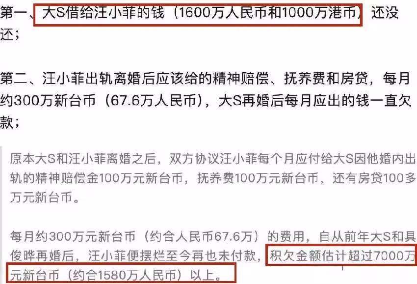 在大S與具俊曄再婚後,S媽說這筆錢汪小菲就沒有再出,如今累積下來已經欠了7000萬台幣(1580萬人民幣)。