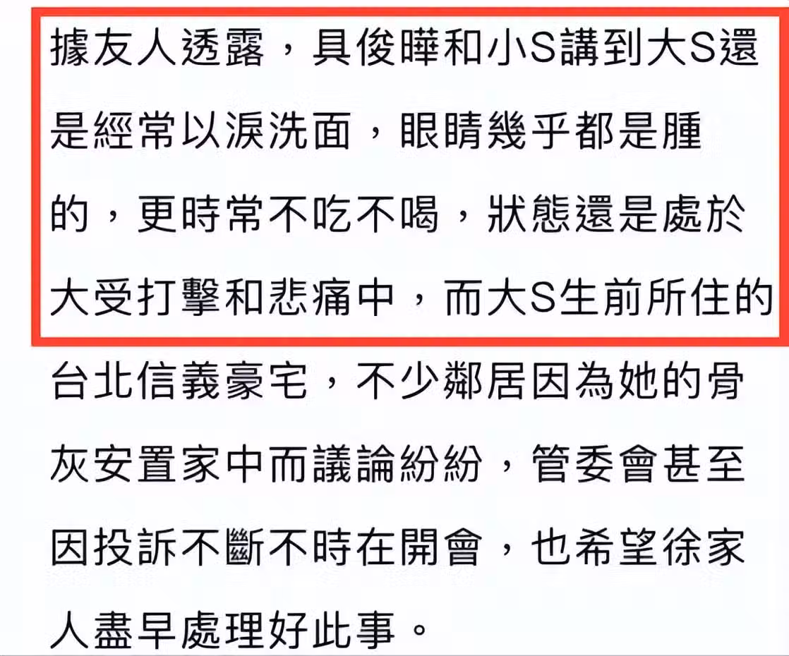 好友還透露了具俊曄當下的狀態,說具俊曄和小S講到大S還是經常以淚洗面,眼睛幾乎都是腫的,更是常常不吃不喝,狀態還處於巨大打擊和悲痛中。