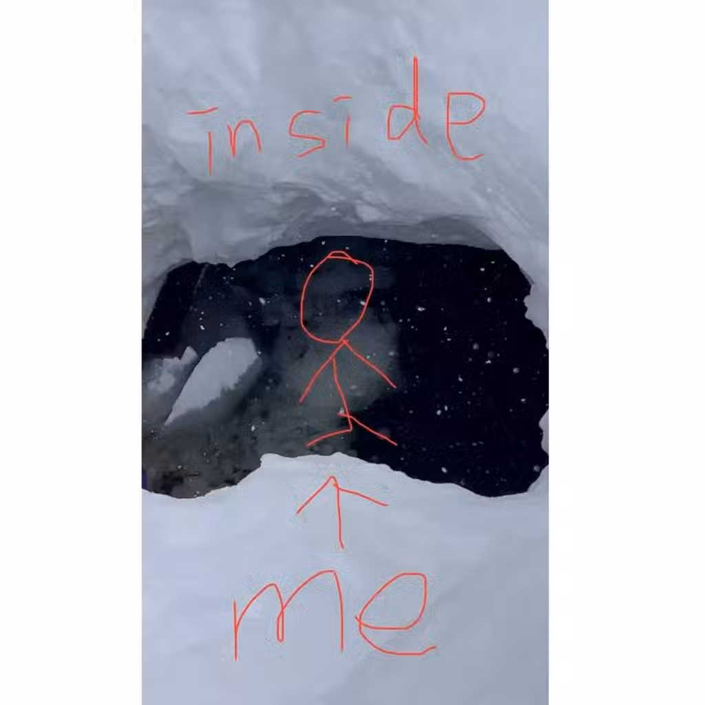 照片可見,李彩樺在雪山上跌進了一個布滿積雪的洞穴,她在積雪上畫上火柴人代表自己,並寫上「inside」和「me」,表示自己跌入溶化後的裂縫柱洞,洞裡看到已溶化的積雪,深不見底。