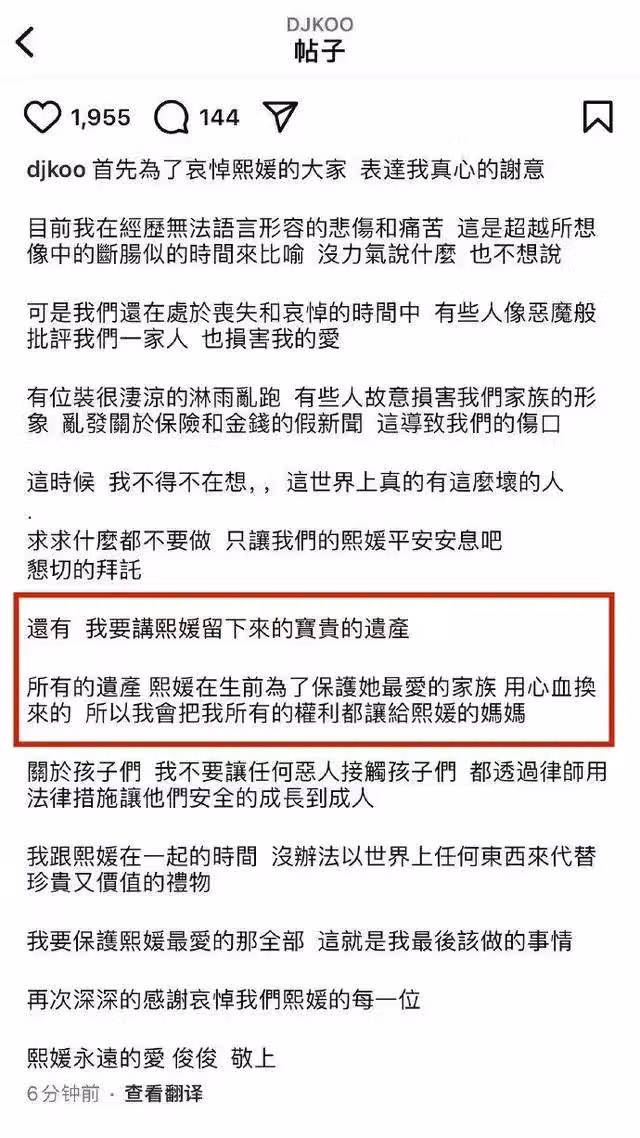 在此之前,大S的親屬也透露,具俊曄根本不在乎遺產,他只想要大S。