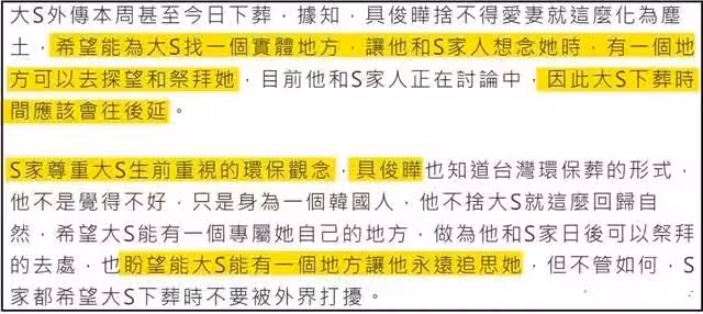 根據台媒最新消息,大S骨灰的安置有兩種方式。一種是找一個塔位,一種是找一塊墓地,立一個大S的雕像。