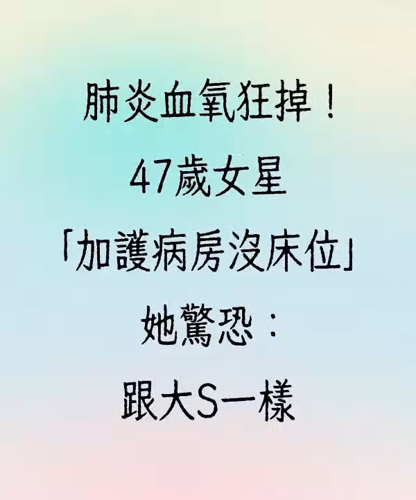 肺炎血氧狂掉!47歲女星「加護病房沒床位」 她驚恐:跟大S一樣!
