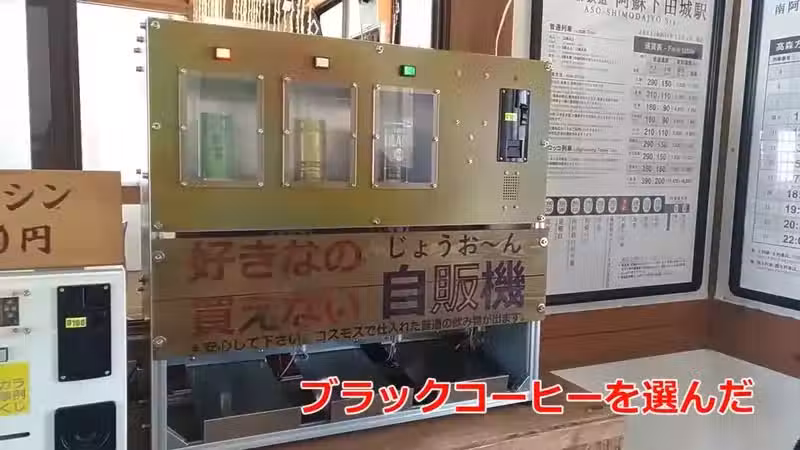 這台販賣機在去年也曾經成為話題被網友注意到,還特別為此錄下了整段購買選物的過程,所以即便大家沒有親自跑到車站投幣,也可以感受到這台販賣機的威力,比方底下這個例子一樣選了咖啡,中間過程機器就開始唱歌,說什麼想要喝好喝的果汁,等音樂聲跑完結果跑出一罐綠茶,而且還伴隨著BGM,感覺買個東西都在被機器嘲諷一樣