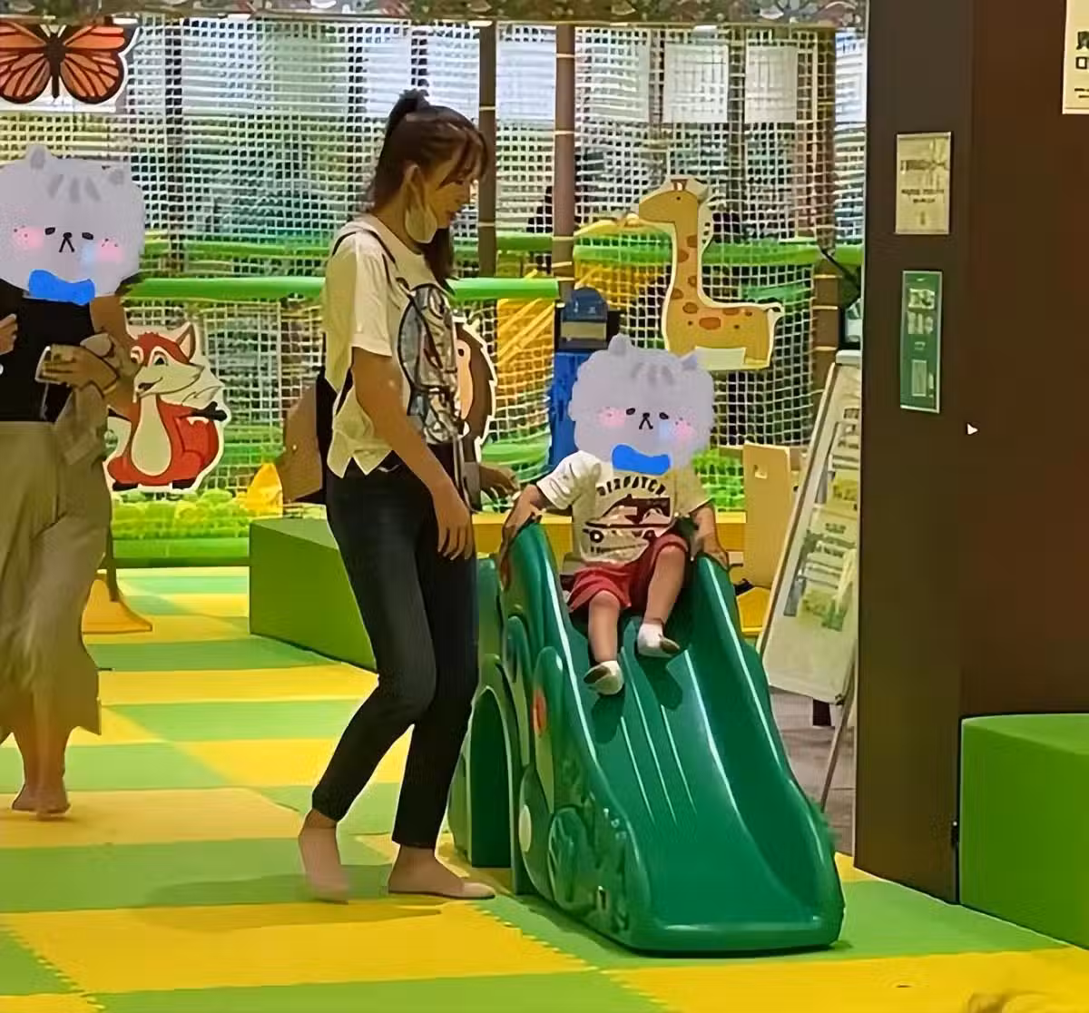陪兒子玩耍,背著兒子的包包和水壺,溫柔媽媽的形象獲得稱讚。