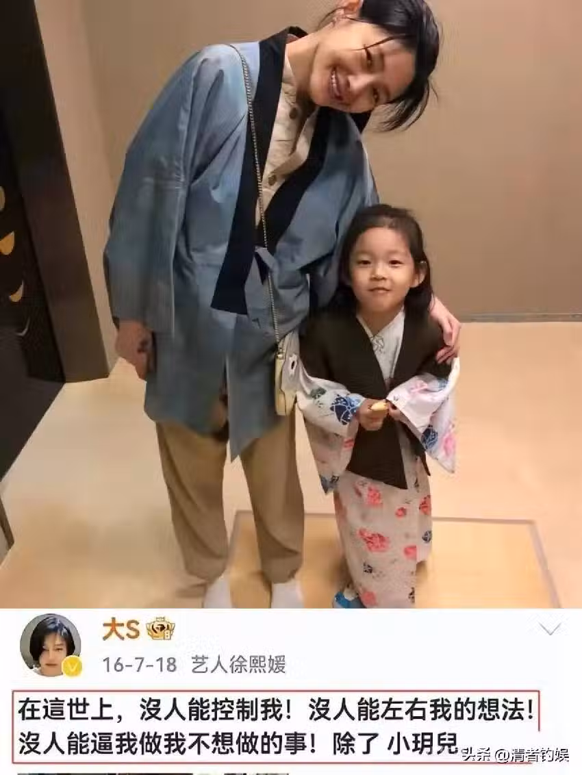 明明生前大s最寶貴的是自己的女兒,她曾發文說:「在這世上,沒人能控制我,沒人能左右我的想法,沒人能逼我做我不想做的事情,除了小玥兒。