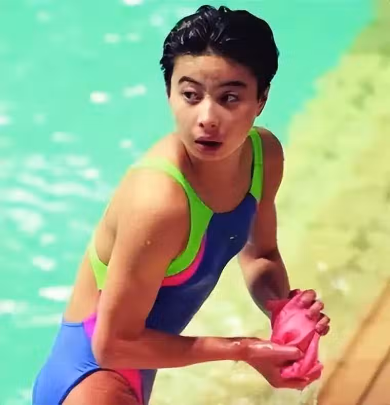 從前的她可以跳10米台,後來的她更多的跳3米台。