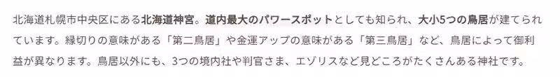 C網站:「佇立於面對北海道神宮本殿的地方的第二鳥居。據說穿過這座第二鳥居的時候祈禱,就可以斬斷人際關係的煩惱、疾病、賭博、成癮等虐緣。北海道神宮的第二鳥居在斬斷虐緣、改變現狀這方面的靈驗程度,據說是全國頂尖。」